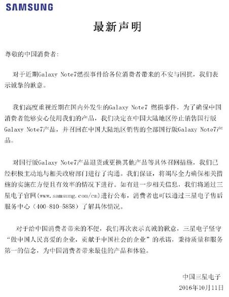 今日17时16分,三星(中国)投资有限公司通过微博就Galaxy Note7燃损事件向中国消费者致歉,称决定在中国大陆地区停止销售国行版Galaxy Note7产品,并召回在中国大陆地区销售的全部国行版Galaxy Note7产品。
