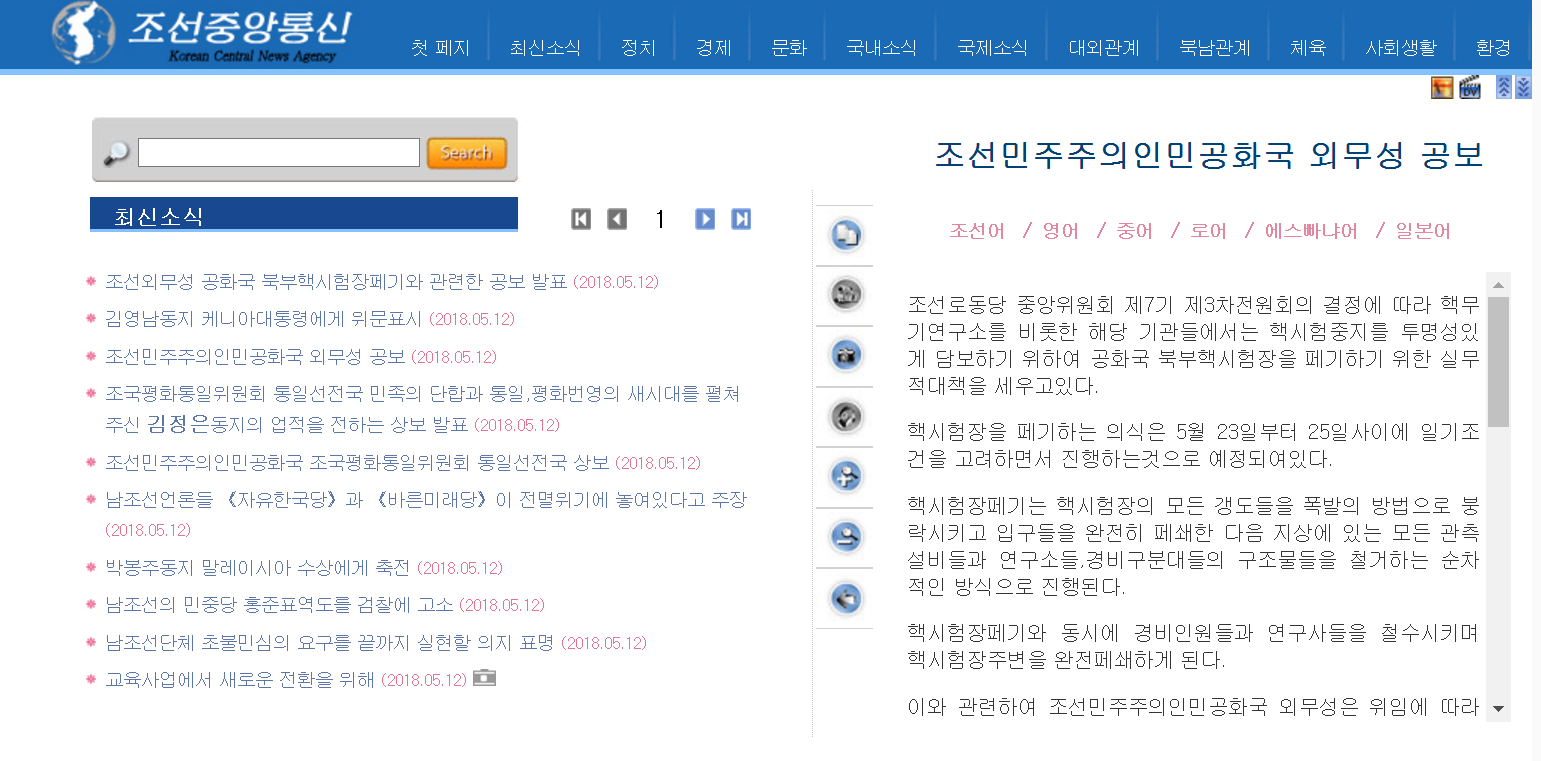 根据朝鲜劳动党第七届中央委员会第三次全会决议,核武器研究所等有关机构为透明地保障核试验停止,正在采取废弃朝鲜北部核试验场的业务措施。