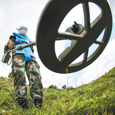 中国维和部队军人在黎巴嫩南部进行清排探测作业。