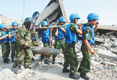 中国维和部队官兵在黎巴嫩南部转移未爆航弹。