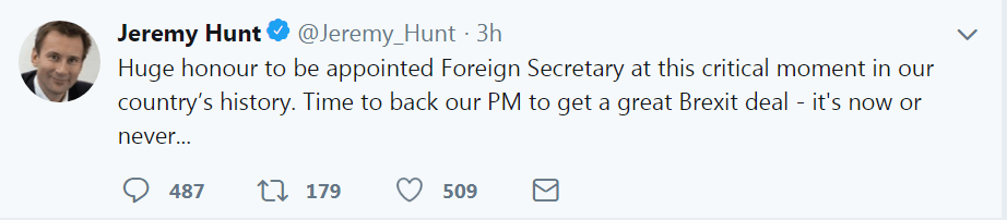 亨特获得任命后在推特上说:“非常荣幸能够在这个国家历史上的关键时刻被任命为外交大臣。是时候支持我们的首相达成一个好的脱欧协议了,机不可失……”