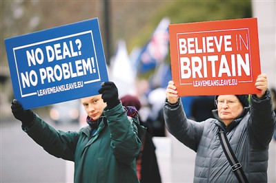 英国议会下院就“脱欧”协议草案进行表决的时间已经从2018年12月推迟到2019年1月,“脱欧”前景依然不明。图为1月7日,支持英国“硬脱欧”的人士在英国首都伦敦的议会大厦外挥舞标语。(新华社 蒂姆·爱尔兰 摄) |