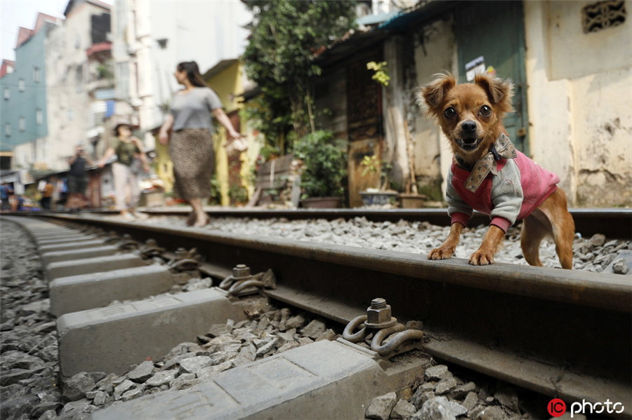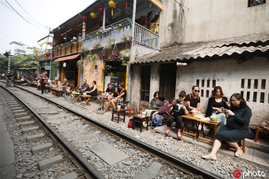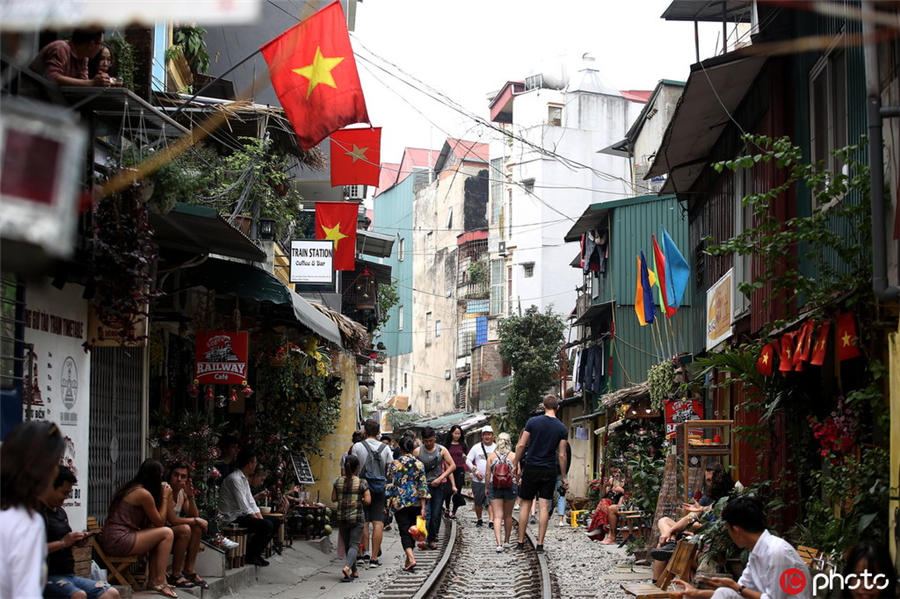 当地时间2019年3月28日,越南河内,贯穿河内一老住宅区的铁道,吸引游客拍照游玩。这条位于越南老城区的火车街吸引游客络绎不绝,旅游业和咖啡馆生意火爆。