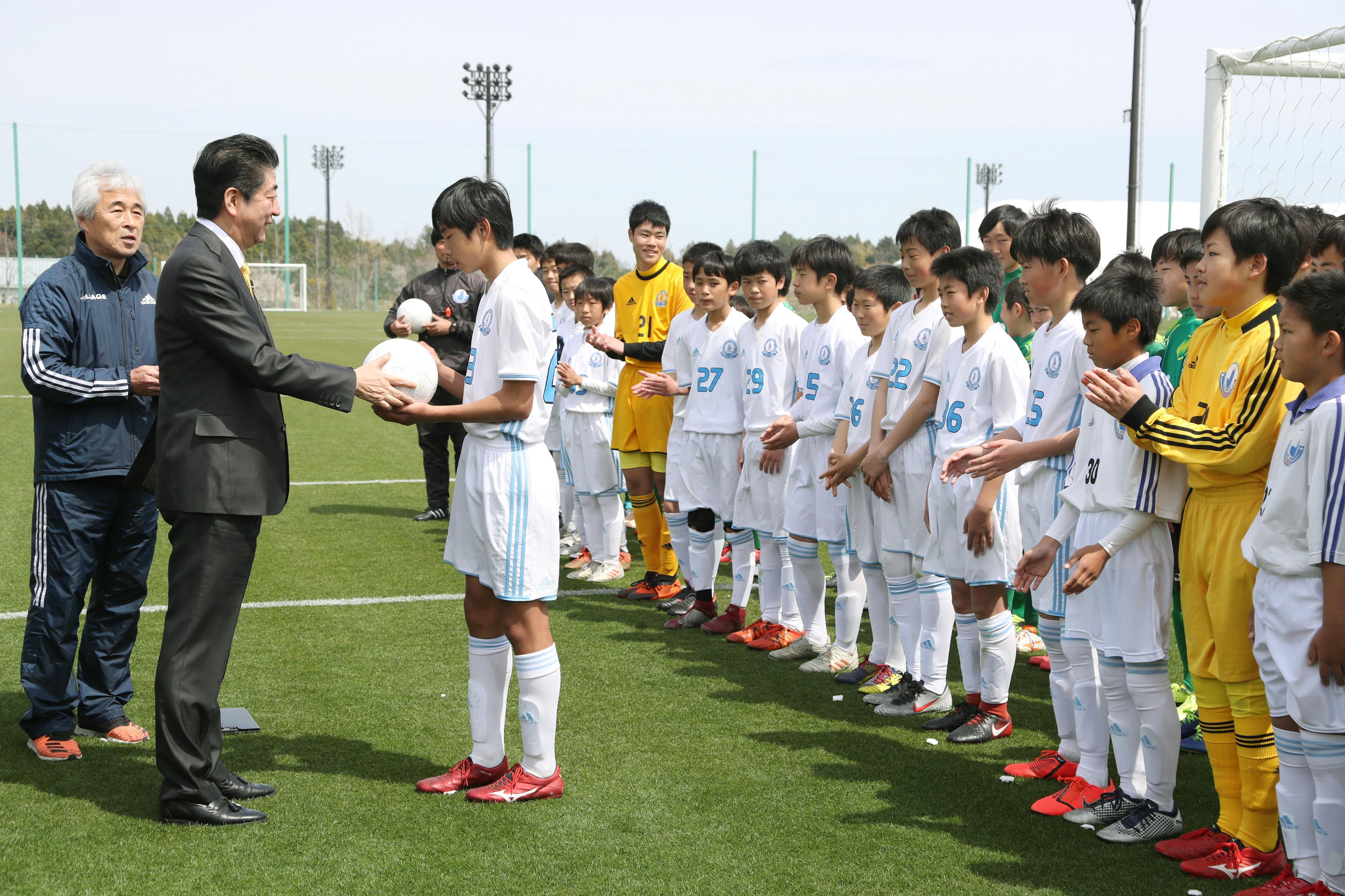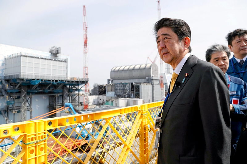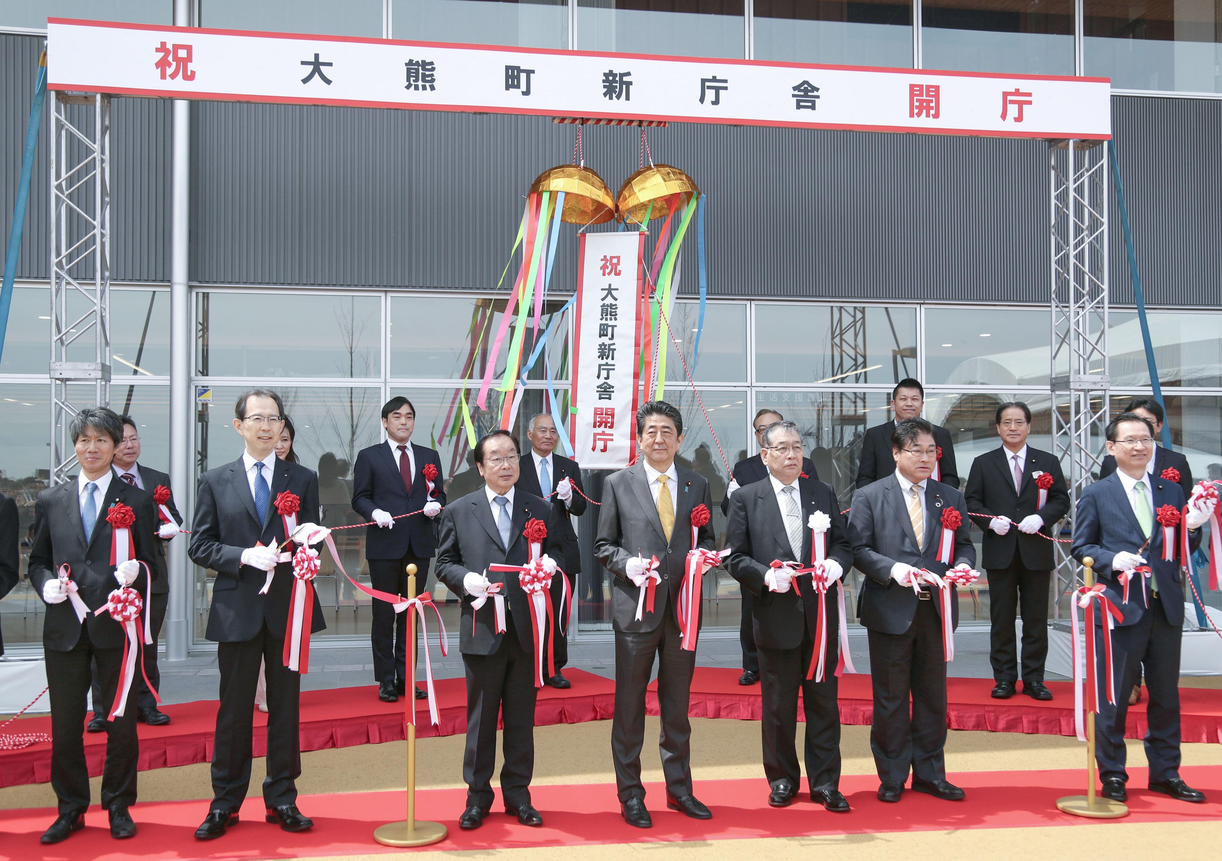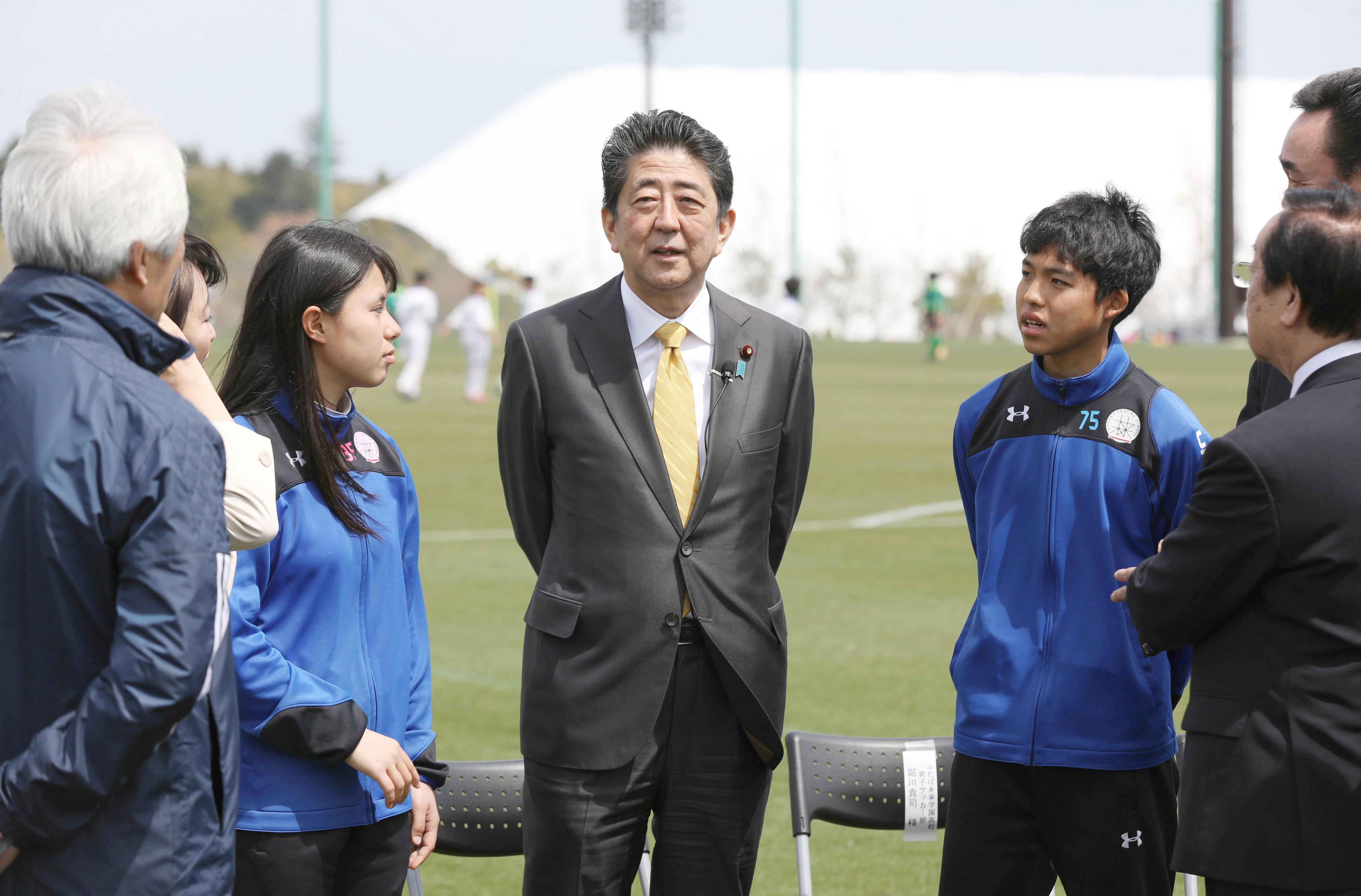 当地时间2019年4月14日,日本福岛县大熊町,日本首相安倍晋三造访当地,视察福岛核灾区重建情况,赴福岛第一核电站视察,并走访学校,与学生交流,出席大熊町新厅舍开厅仪式。