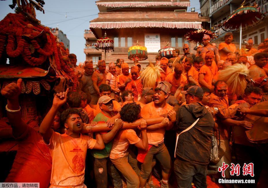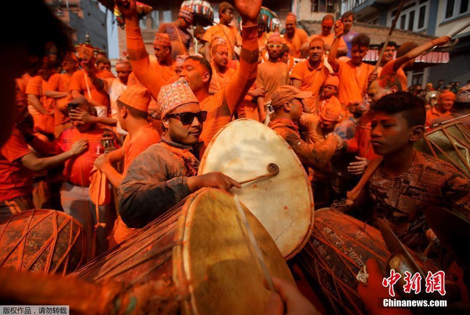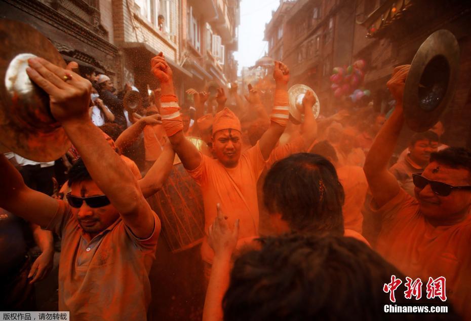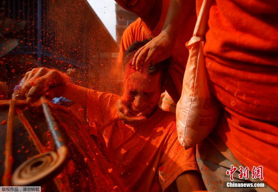 当地时间4月15日,尼泊尔巴克塔普尔,人们互相抛撒朱砂粉,庆祝朱砂节(Sindoor festival )以及尼泊尔新年。