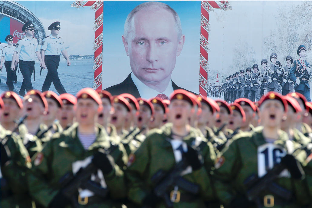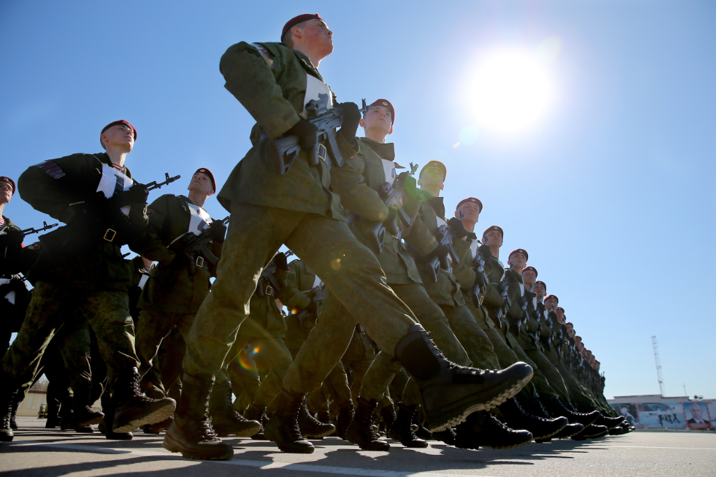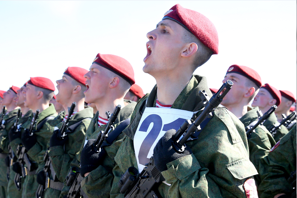 当地时间2019年4月16日,俄罗斯莫斯科地区,俄罗斯联邦国民警卫队士兵进行训练,为即将到来的胜利日阅兵做准备。