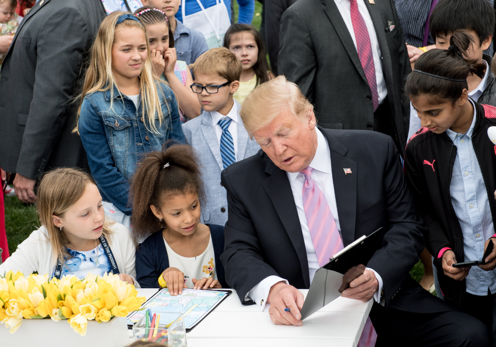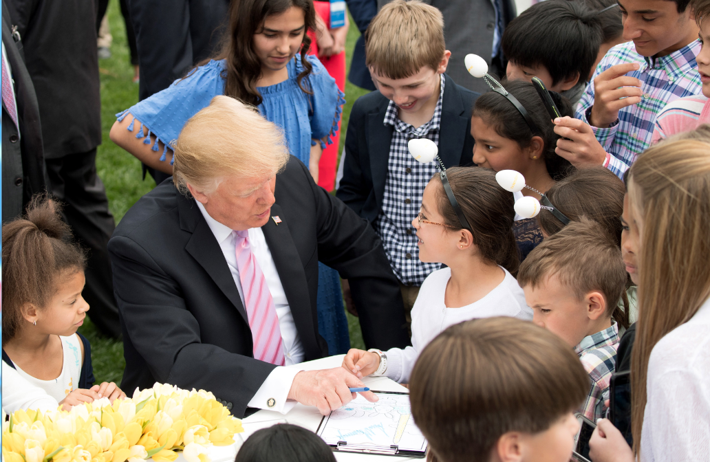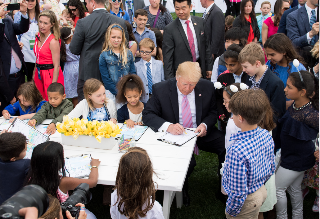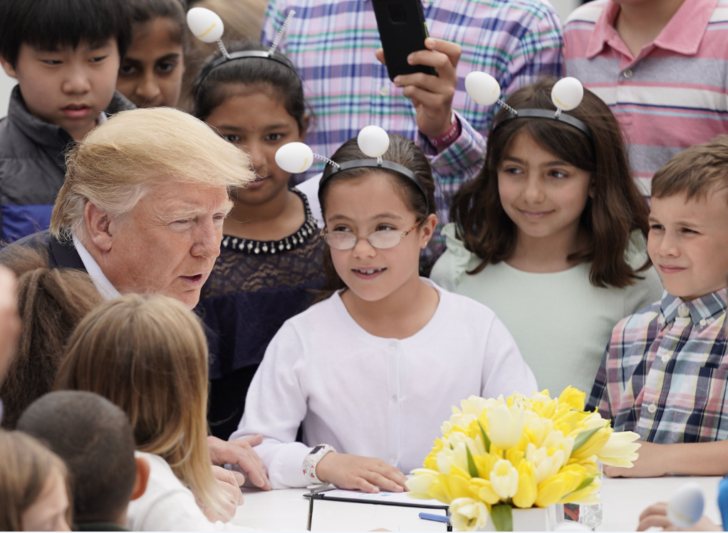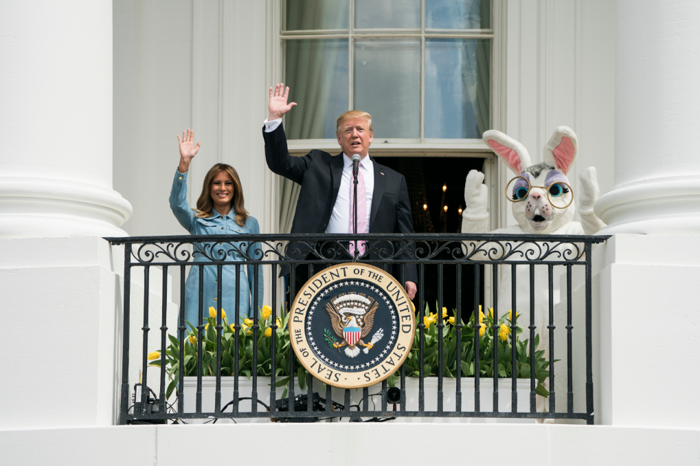 当地时间2019年4月22日,美国华盛顿,美国总统特朗普和妻子梅拉尼娅在白宫举行一年一度的复活节滚彩蛋活动。 特朗普站在阳台上对人群说,美国目前发展非常不错,失业率史上最低,减税和军队重建也取得好成绩,美国制造也出产了许多好产品。