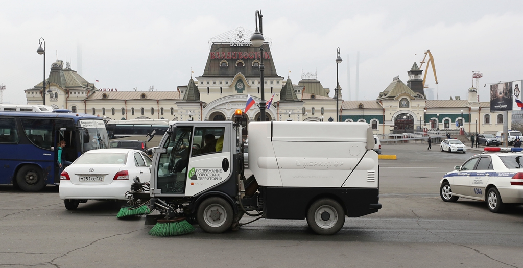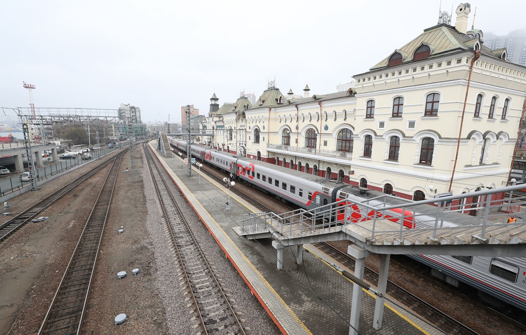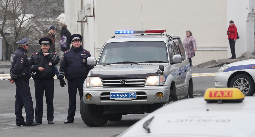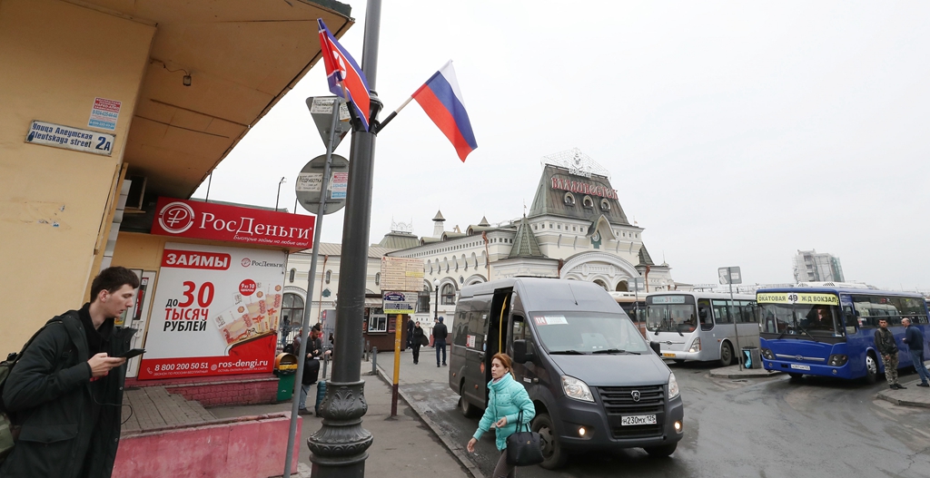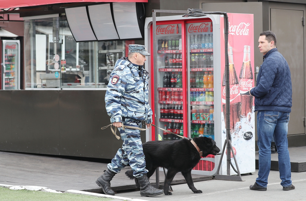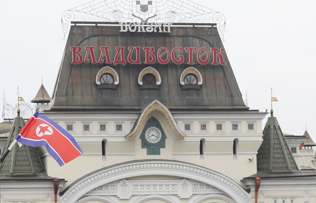 当地时间2019年4月24日,俄罗斯符拉迪沃斯托克,符拉迪沃斯托克火车站外悬挂朝鲜国旗,当地安全人员携带警犬加强安保工作。朝鲜中央通讯社今天(4月24日)清晨刊登称,朝鲜领导人金正恩已在今日凌晨乘坐专列出访俄罗斯。据外媒报道,金正恩的专列将于当地时间今天下午5点左右抵达符拉迪斯沃斯托克。