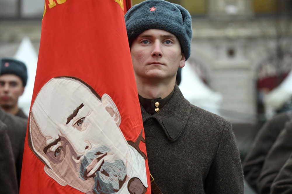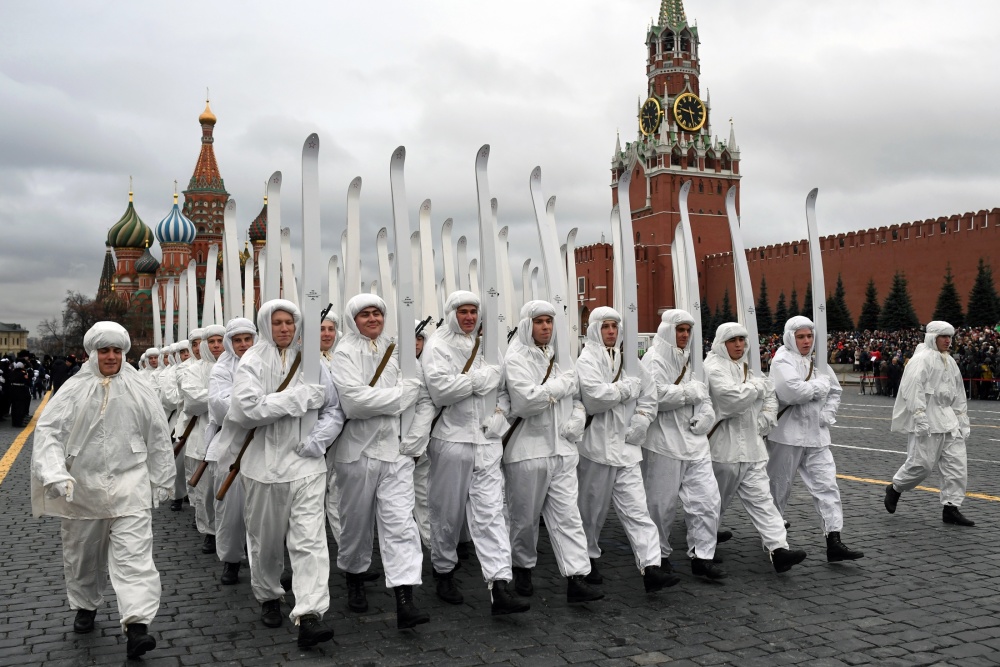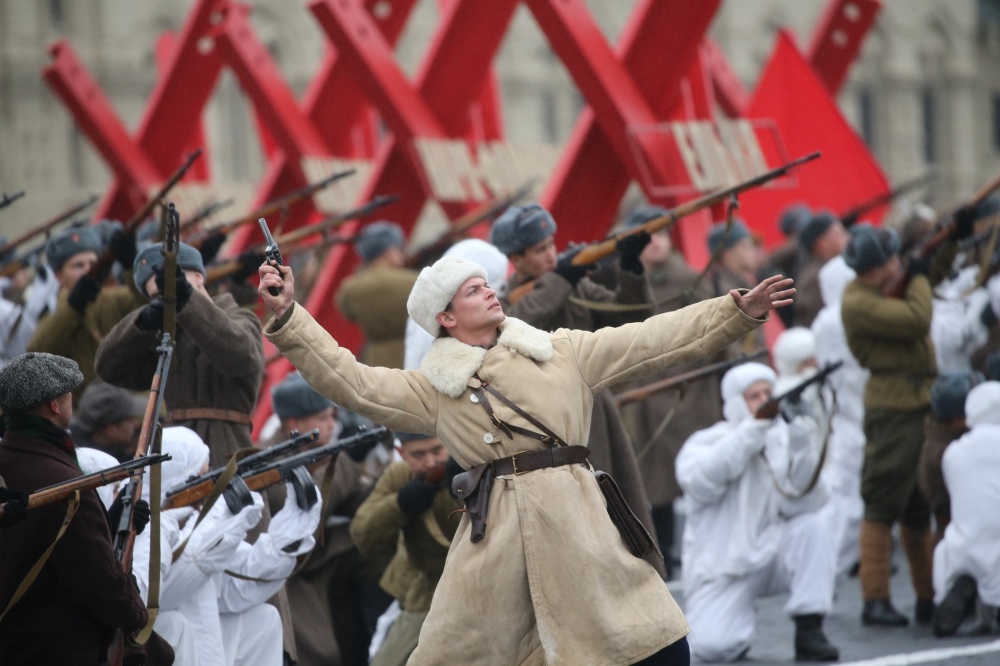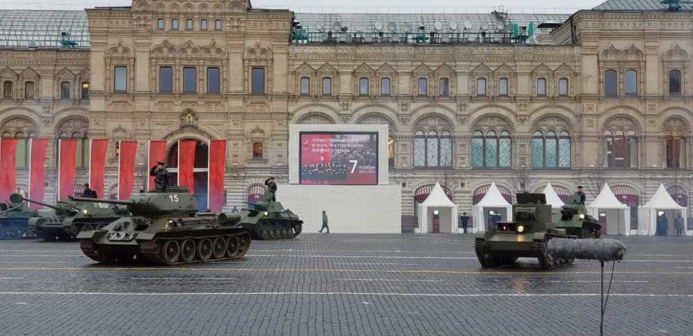 当地时间2019年11月7日,俄罗斯在红场举行游行纪念1941年红场阅兵78周年。受阅士兵身穿当年款式的军服,驾驶老旧的坦克参加阅兵。