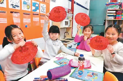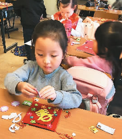 每逢春节,师生都会装饰学校,所有的装饰物都含有中国元素,比如对联、红灯笼、龙的图案、福字等。同时,除了围绕春节主题设计的文化课之外,老师们还会在课上带着孩子们做手工、画画等,比如剪“春”字、画属相、写“福”字。一个“春”字、一个“福”字,让“年”跳出了纸面。