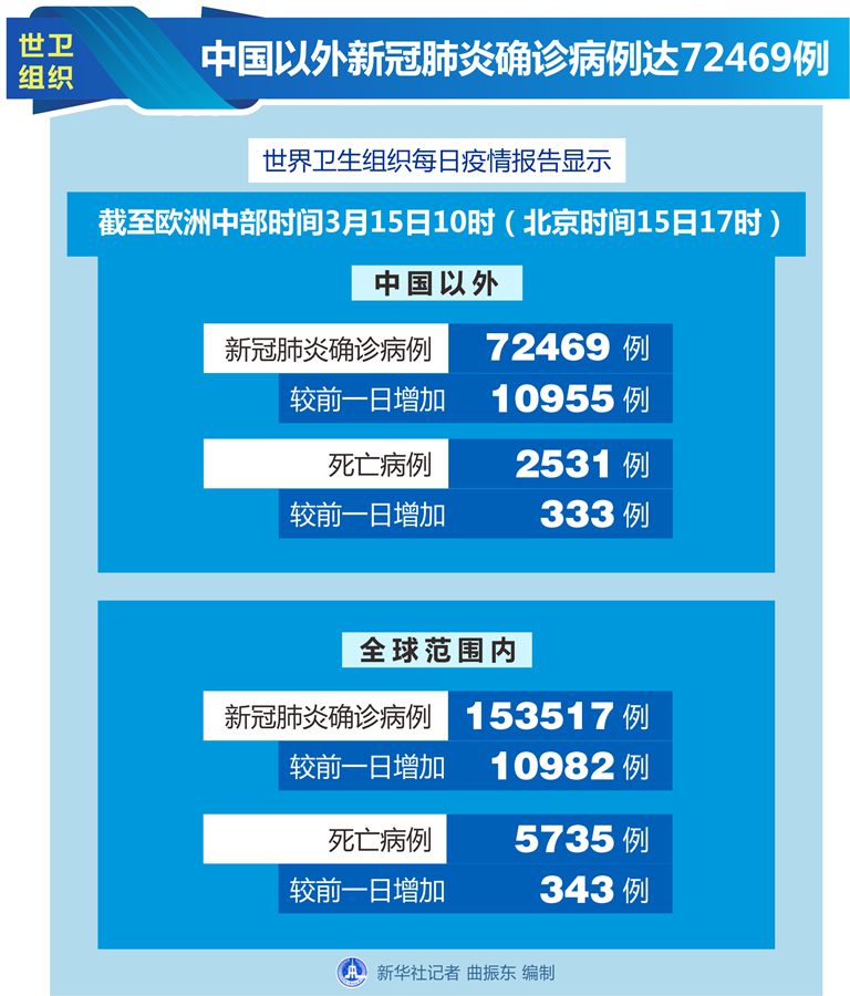 新华社日内瓦3月15日电(记者刘曲)世界卫生组织15日公布的最新数据显示,中国以外新冠肺炎确诊病例达到72469例。
