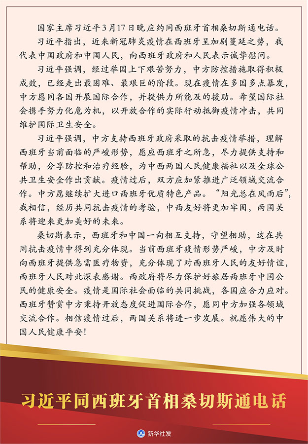 习近平强调,中方支持西班牙政府采取的抗击疫情举措,理解西班牙当前面临的严峻形势,愿应西班牙之所急,尽力提供支持和帮助,分享防控和治疗经验,为中西两国人民健康福祉以及全球公共卫生安全作出贡献。疫情过后,双方应加紧推进广泛领域交流合作。中方愿继续扩大进口西班牙优质特色产品。“阳光总在风雨后”,我相信,经历共同抗击疫情的考验,中西友好将更加牢固,两国关系将迎来更加美好的未来。