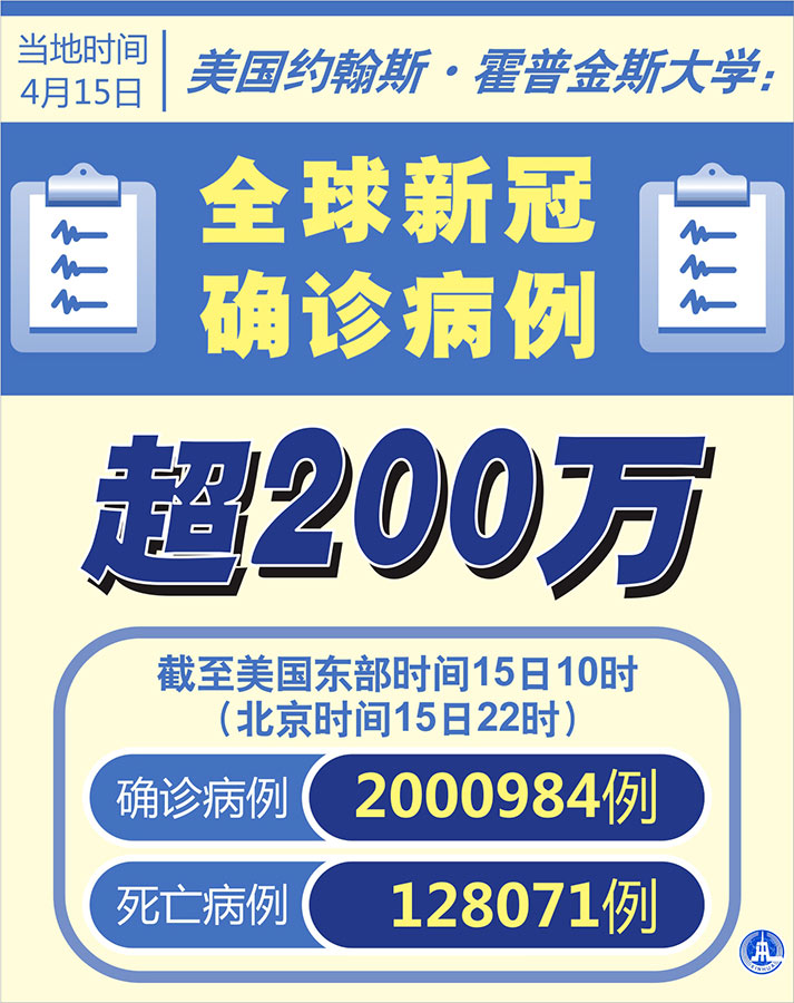 新华社纽约4月15日电 美国约翰斯·霍普金斯大学15日发布的新冠疫情最新统计数据显示,截至美国东部时间15日10时(北京时间15日22时),全球新冠确诊病例达2000984例,死亡病例为128071例。