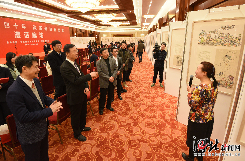 参加活动的观众在参观“砥砺奋进四十年改革开放再出发——漫话廊坊”活动创作作品,感受廊坊改革开放四十年巨变。 刘向摄