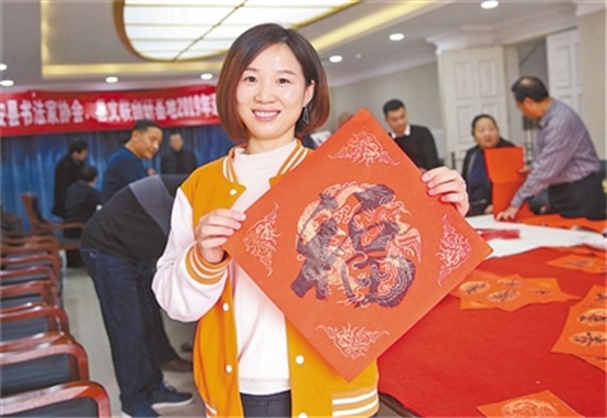 春节临近,年味渐浓,固安县组织域内书画爱好者深入农村、企业、学校,开展“福到万家”写春联、送祝福公益活动,免费为群众现场写春联、送福字、画年画,营造喜庆、祥和的节日氛围。图为一位村民展示书画爱好者写的福字。