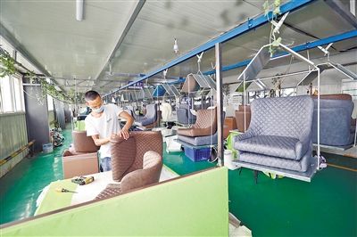 图为工作人员正在沙发车间加紧生产。 记者 贾珺 摄