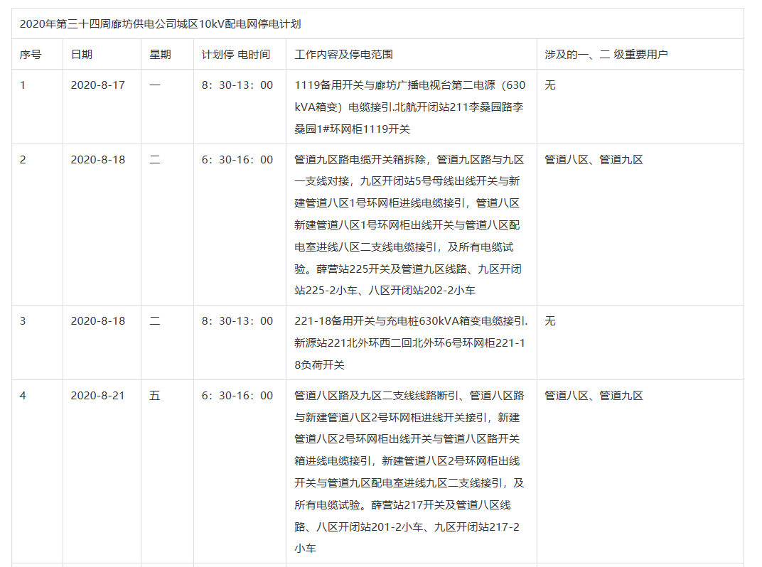 2020年第三十四周廊坊供电公司城区10kV配电网停电计划