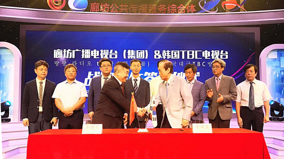 环京津新闻网讯(记者 张静)7月24日上午,廊坊广播电视台与韩国TBC电视台签订战略合作协议,廊坊广播电视台党委书记、台长王建久、韩国TBC电视台社长金廷吉分别代表双方签约。