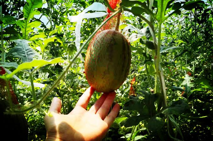 图为固安县周家务村卡尔叔叔幸福农场里的麒麟瓜垂挂在藤蔓上。