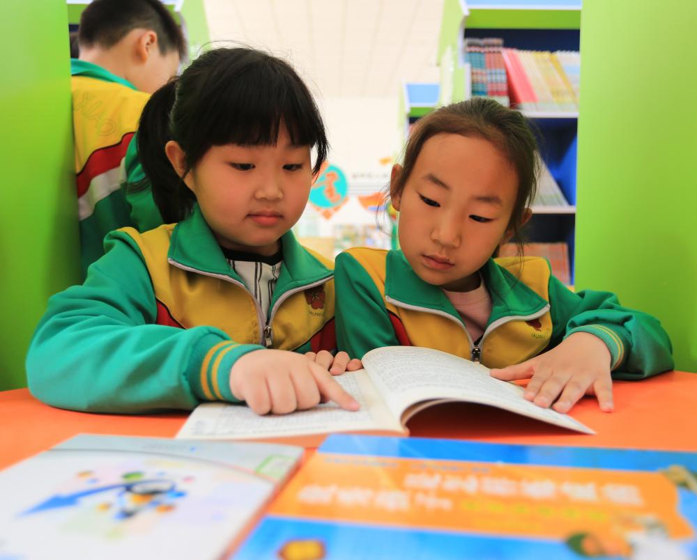 图为固安县第四小学的学生正在校内图书馆读书。