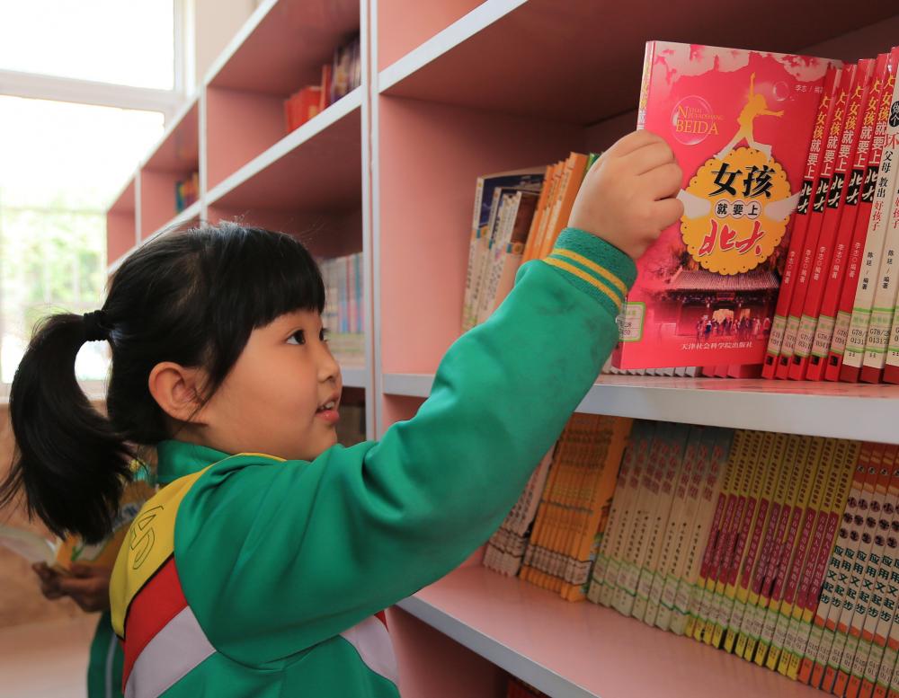 图为固安县第四小学的学生在县内图书馆挑选书籍。