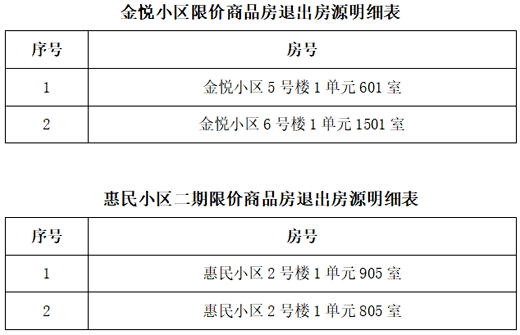 中号家庭自愿放弃购买退出的房源共计4套,其中金悦小区限价商品房退出房源2套,惠民小区二期限价商品房退出房源2套。