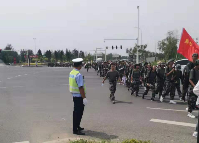 在廊坊市交警二大队警力的护卫下,截止至下午14时许,廊坊一中1800余名师生往返30多华里回到学校,途中歌声笑语此起彼伏,圆满完成了远足锻炼活动。